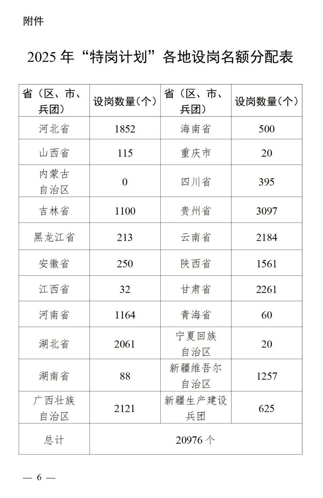 (二)招聘数量。2025年全国计划招聘“特岗计划”教师20976名,各省(区、市)和新疆生产建设兵团的招聘名额见2025年“特岗计划”各地设岗名额分配表(附件)。