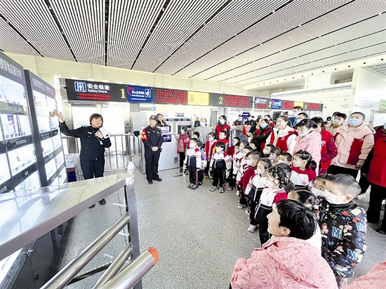 | 近日,陕州区实验幼儿园组织20余名幼儿走进高铁三门峡南站,开展“高铁趣发现,萌娃乐翻天”主题实践活动,让幼儿直观了解高铁出行的基本知识,感受“中国速度”的科技魅力与现代交通的便捷高效。图为工作人员讲解危险品识别及禁止携带乘车的安全知识。 赵静静 曹云 摄 |