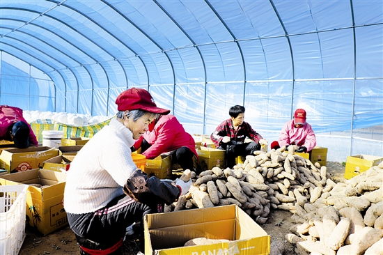 11月27日,市城乡一体化示范区(高新区)大王镇董家村伏岭麦田农民专业合作社种植的红薯喜获丰收,村民忙着采摘红薯,同时进行分拣、分类装箱,运送到地窖贮藏。