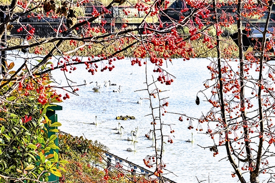 近日,三门峡市区涧河冬日里呈现灵动一幕,一群白天鹅降落在河里,或游弋或休憩,与涧河岸边枝丫垂落的橙红浆果交织点缀,浆果之艳、天鹅之雅,与城市之影层层交织,呈现出野生动物融入城市空间的生态之美,也勾勒出人与自然和谐共生的温暖图景。 杜杰 摄